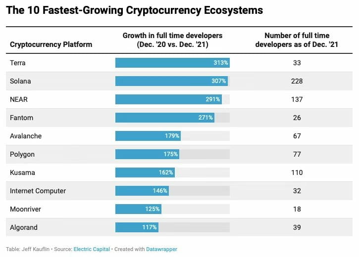 Electric Capital's study analyzed nearly 500,000 sets of code and 160 million code updates. It compared growth in December 2020 and December 2021. For the list below, developers were counted as full-time if they made at least 10 software updates in a month.