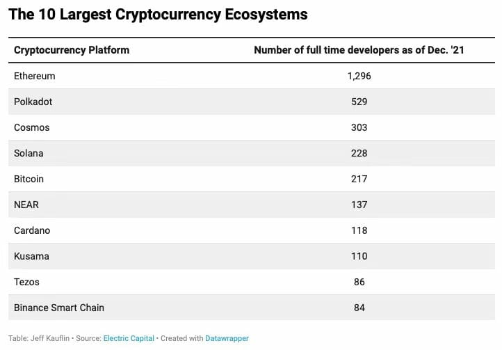 They used data from GitHub, the go-to online repository for developers to store their code, to estimate the number of engineers working on each platform, but their data underestimates the total number of developers because it doesn’t capture the many engineers who write code privately or work at companies like Coinbase.
