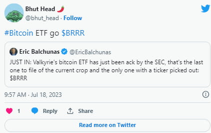 Valkyrie’s latest Bitcoin ETF proposal was filed in late June 2023, amid optimism surrounding BlackRock’s spot BTC ETF application. Valkyrie proposed listing the ETF under the ticker “BRRR,” referencing a popular Bitcoin community meme representing the voice of money printing.