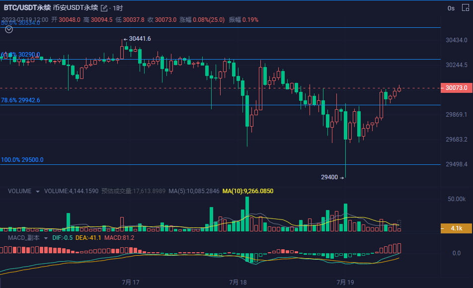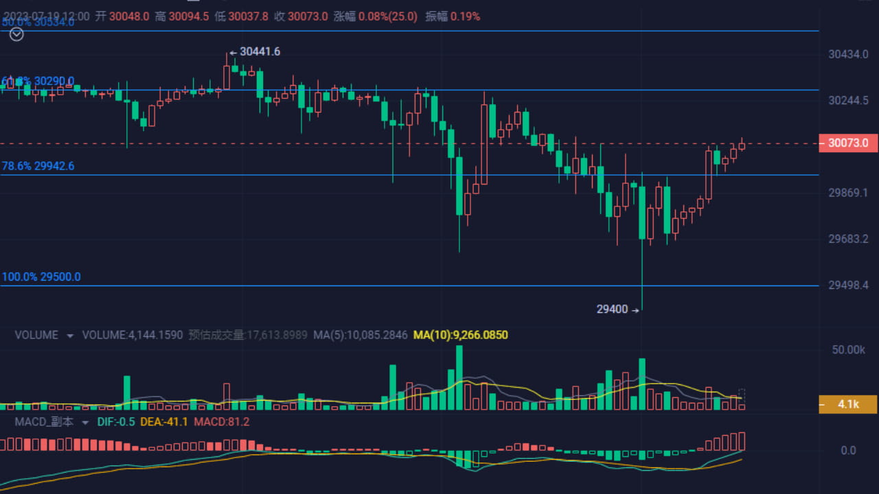 As of the time of posting, the price of BTC is 30060. After a rapid decline to 29400, it rebounded to around 30000 and oscillated. It successfully broke through the pressure and stabilized at 30000 this morning. In the short term, there is a trend of a U-turn.