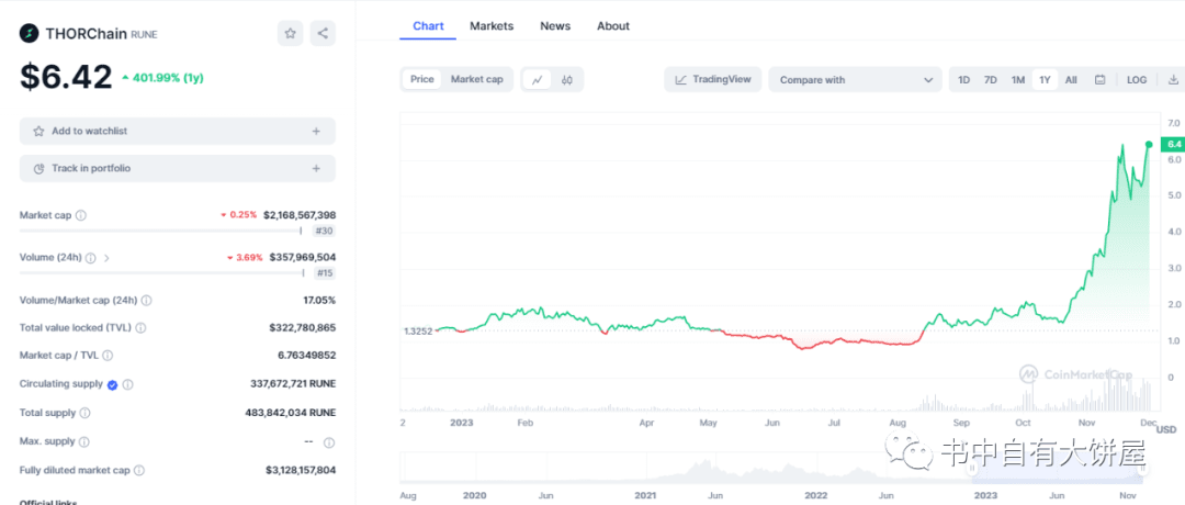 Today we are going to talk about a cross-chain project, because it was mentioned when we talked about flip before. Some friends corrected it, and then found that a good project was missed. It is also among the top 100 in market value, called Thorchain, and it is also a cross-chain. The recent trend of swap is also good, rising from 1 to 6.4. The current market value is 2.1 billion US dollars, ranking 30+.