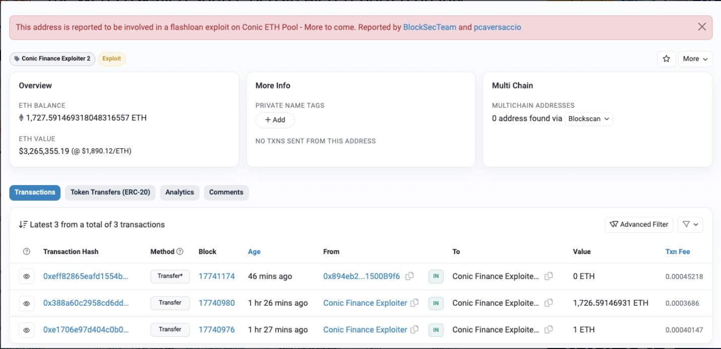 Conic Finance has been exploited for $3.26 million in Ether (ETH), the Web3 risk-alert source Beosin Alert reported on July 21. Nearly the entire amount of stolen cryptocurrency was sent to a new Ethereum address in just one transaction, according to data provided by Beosin.