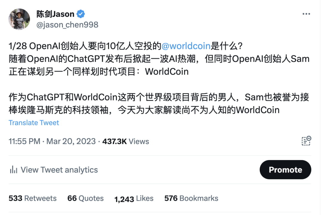 I wrote an article about WorldCoin at the beginning of this year. So far, the article has been read 437K times and has received thousands of likes and reposts. It should be a relatively comprehensive and influential article. I have since communicated with everyone from the community manager to the CEO of WorldCoin, but I do not have any commercial interests in the project, so I wrote a long article and maintained communication with its team. I would like to talk about how I view this project based on this relatively comprehensive information.
