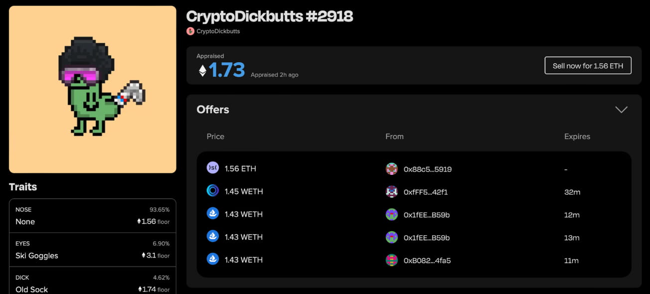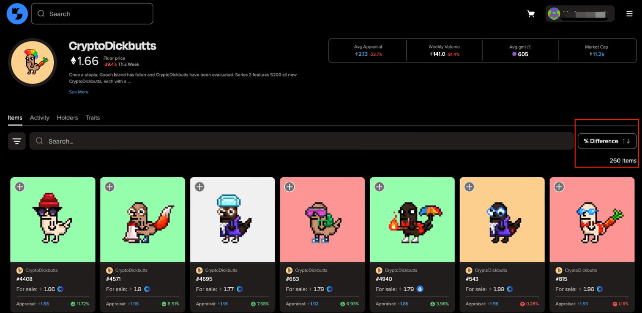 When browsing NFTs in your collection, you can sort by the percentage difference between the official appraisal and the list price, putting the best deals directly at the top.