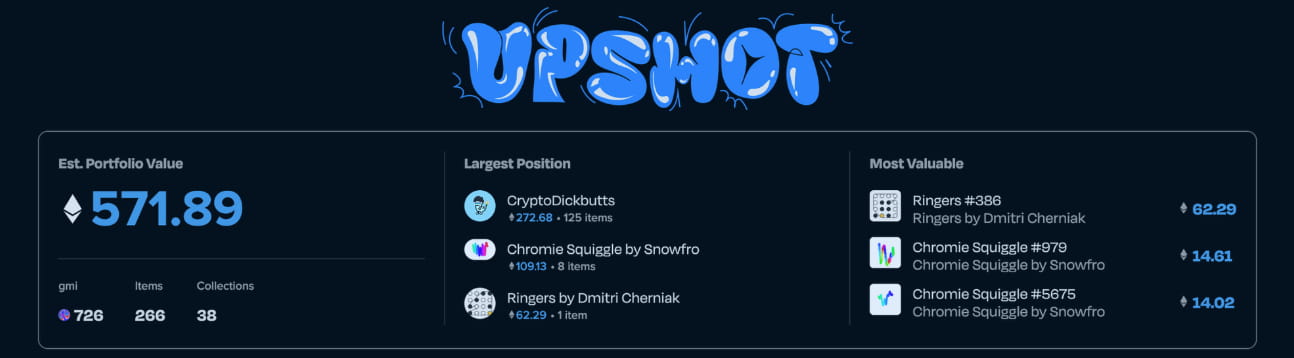 Upshot’s portfolio tracker allows users to assess anyone’s collection in real-time, with useful information about their largest positions, most valuable NFTs, their gmi, and more.