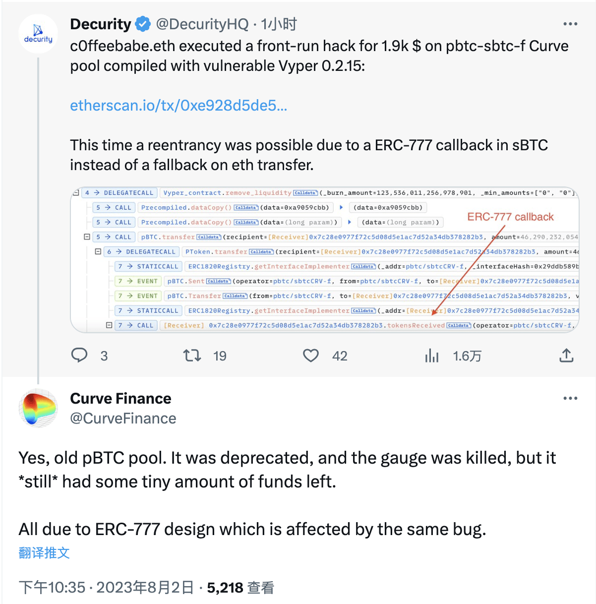 The security team Decurity discovered another security vulnerability on the Curve platform. Curve used ERC-777 Callback in some of the smart contracts of the token market, and this usage has security risks and may be subject to reentry attacks.