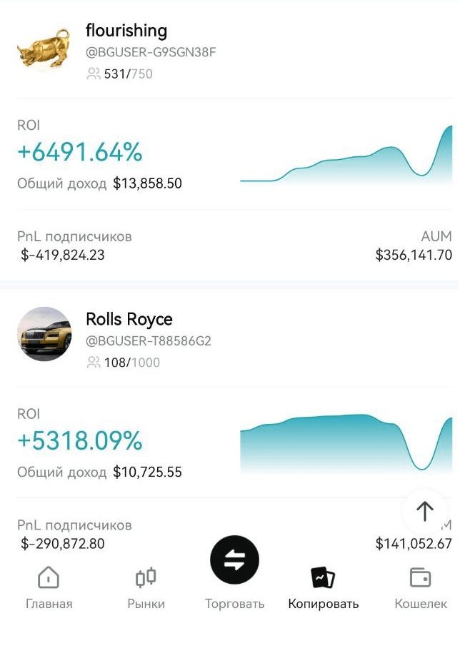 1. High risks. To make huge ROI percentages, you need to trade exclusively with 50's leverage. Perhaps some transactions will bring profit, but in general, such leverage will eliminate your transaction volume with any minor movement in the market. The trader can add margin, but as a result, and this can be seen on the screen, everyone who repeats transactions goes into deep minuses. For example, the trader’s ROI is +6491%, and the PNL of subscribers is MINUS $419,824. The trader has an income of $13,858, and subscribers have losses of almost half a million dollars. Therefore, be careful when studying statistics; ROI and PNL from a trader do not guarantee your income. Moreover, scroll through traders with thousands of% profit - these are huge risks; responsible traders with good results over a long distance are in the middle of the ratings. It is extremely important to do your research and analyze traders' performance before copying their trades!