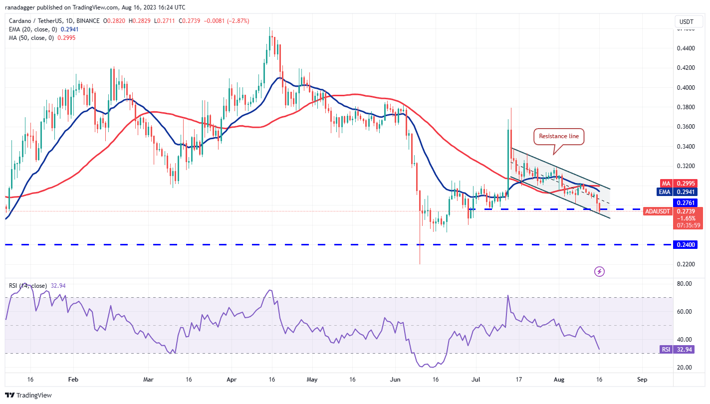 The ADA/USDT pair has reached the support line of the channel. If this support gives way, the pair could tumble to $0.26 and subsequently to $0.24. The bulls are expected to guard this level with all their might because if this support crumbles, the pair could resume the downtrend.