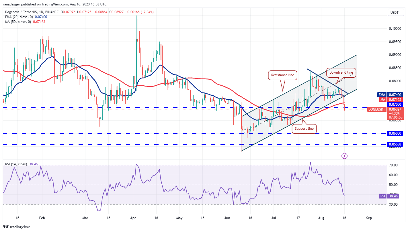 The bulls are likely to guard the breakout level of $0.07. If the price rebounds off this level, the DOGE/USDT pair may climb to the 20-day EMA ($0.07) and later to the downtrend line. If the price turns down from this resistance, it will increase the likelihood of a drop below $0.07. If that happens, the pair could nosedive to $0.06.