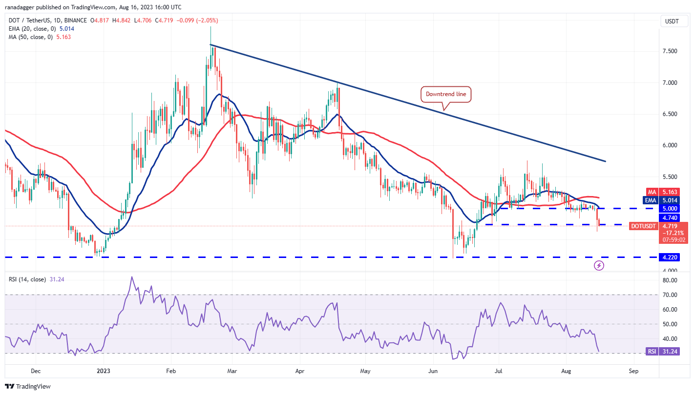 The bulls purchased the dip below the next support at $4.74, but they are struggling to sustain the recovery. This suggests that the bears continue to sell on every minor relief rally. If the price continues lower and dips below $4.60, it will suggest that the DOT/USDT pair is in a firm bear grip. That could result in a decline to $4.22.
