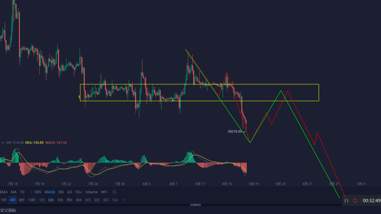 In terms of logarithmic coordinates, it has now fallen below the trend line connecting the 19XXX-24XXX lows. The 15XXX trend line has not yet fallen below $27,606, and the above position is a logarithmic coordinate.