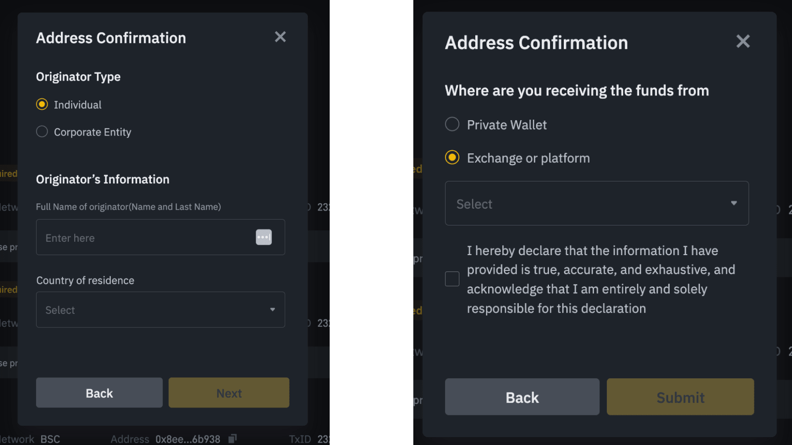 You will need to go to the crypto deposit page of your Binance account and click on transactions pending credit. After that, you will see a pop-up message to provide additional information on the originator, such as: