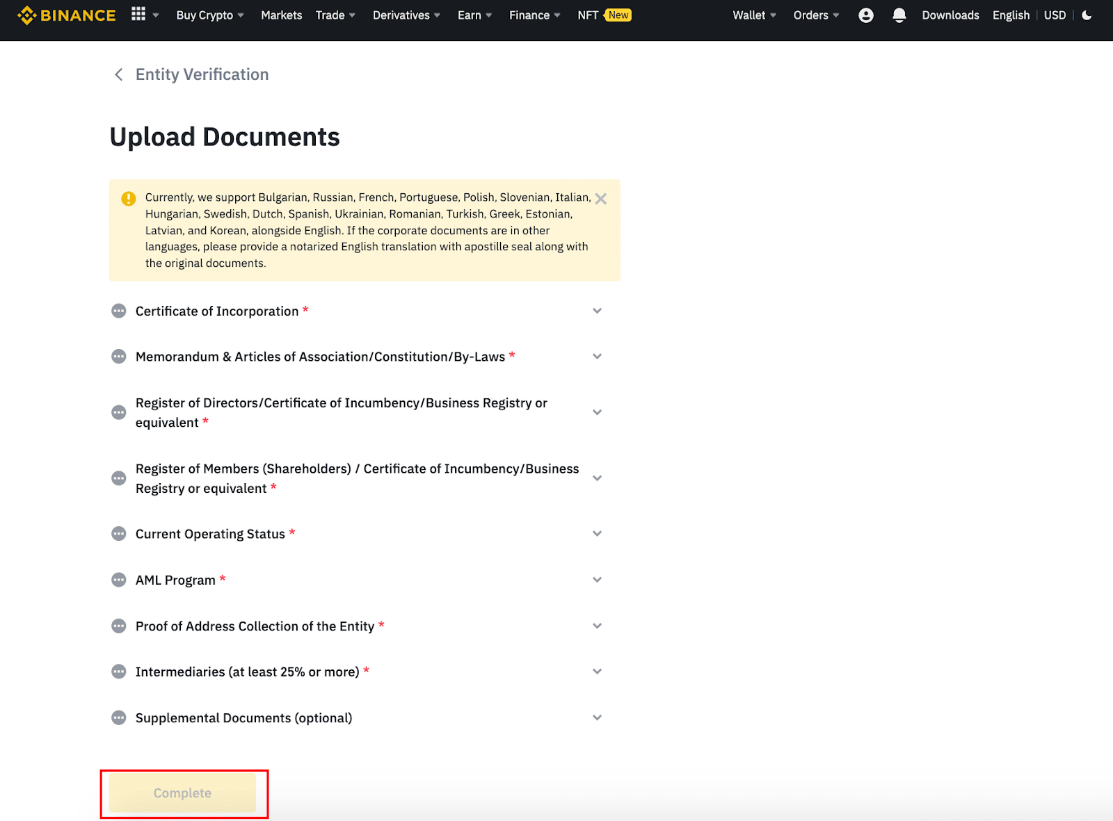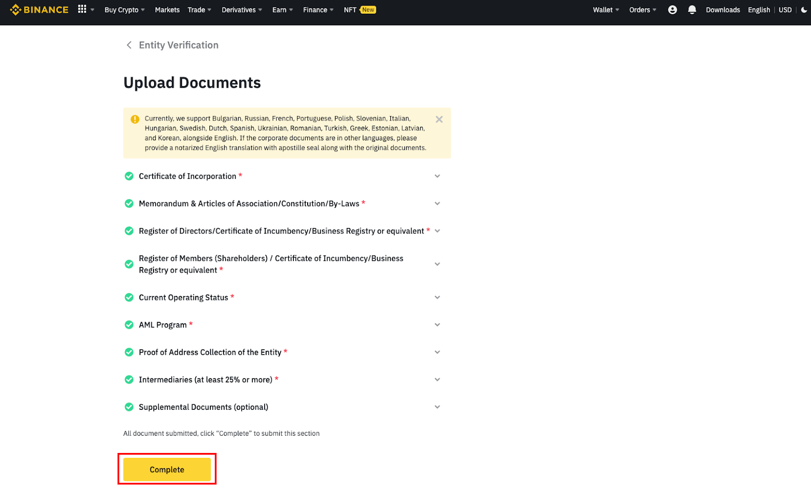 In the event that we require further clarification or documentation, you will receive an email from corporate-kyc@binance.com. Please provide the supplement document via email.