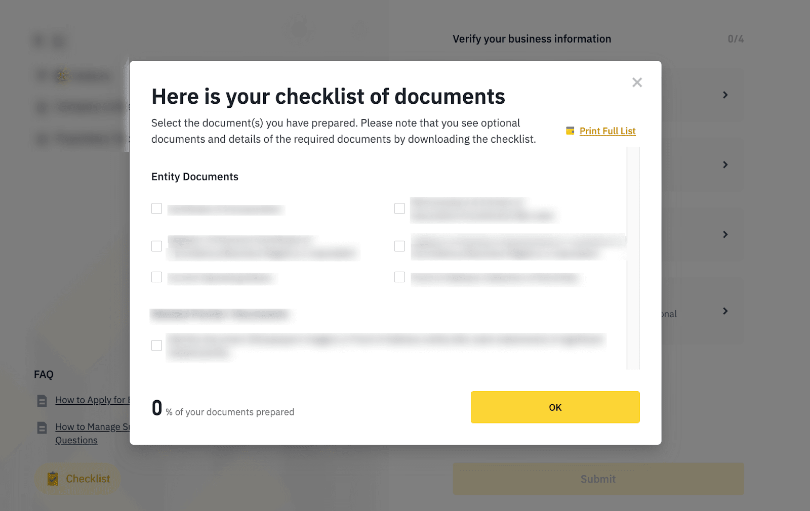 Before entering the verification process, you will also need to prepare the corporate documents shown on the checklist. The checklist will be displayed based on your registered country/region, the legal form, and the entity type. You might select [Print Full List] to print the checklist for reference.
