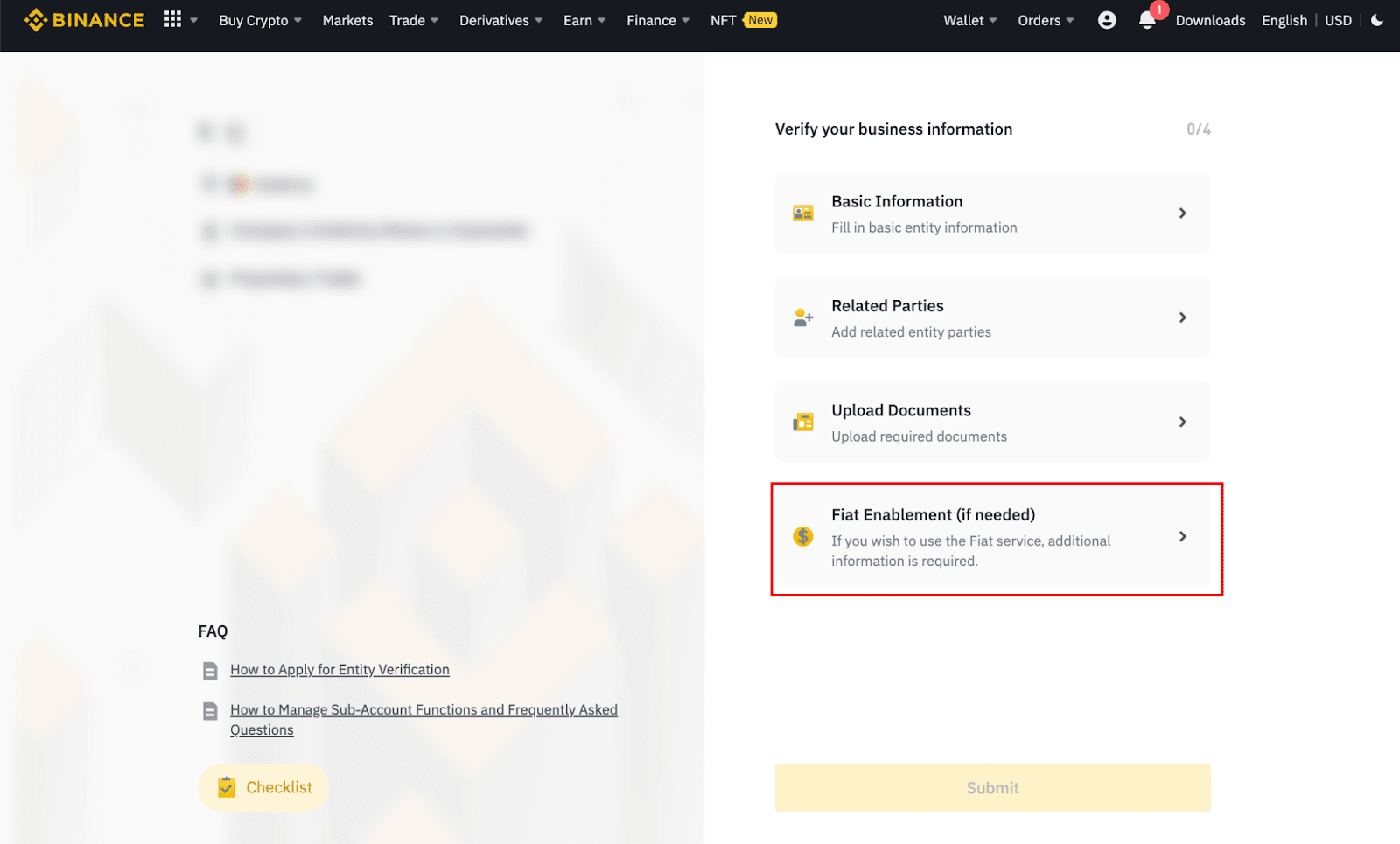 B. If you have completed the crypto verification first and would like to apply for fiat services in the future, you may go to the User Center to enable it under [Identification]. Please submit the following information to upgrade your account for fiat access: