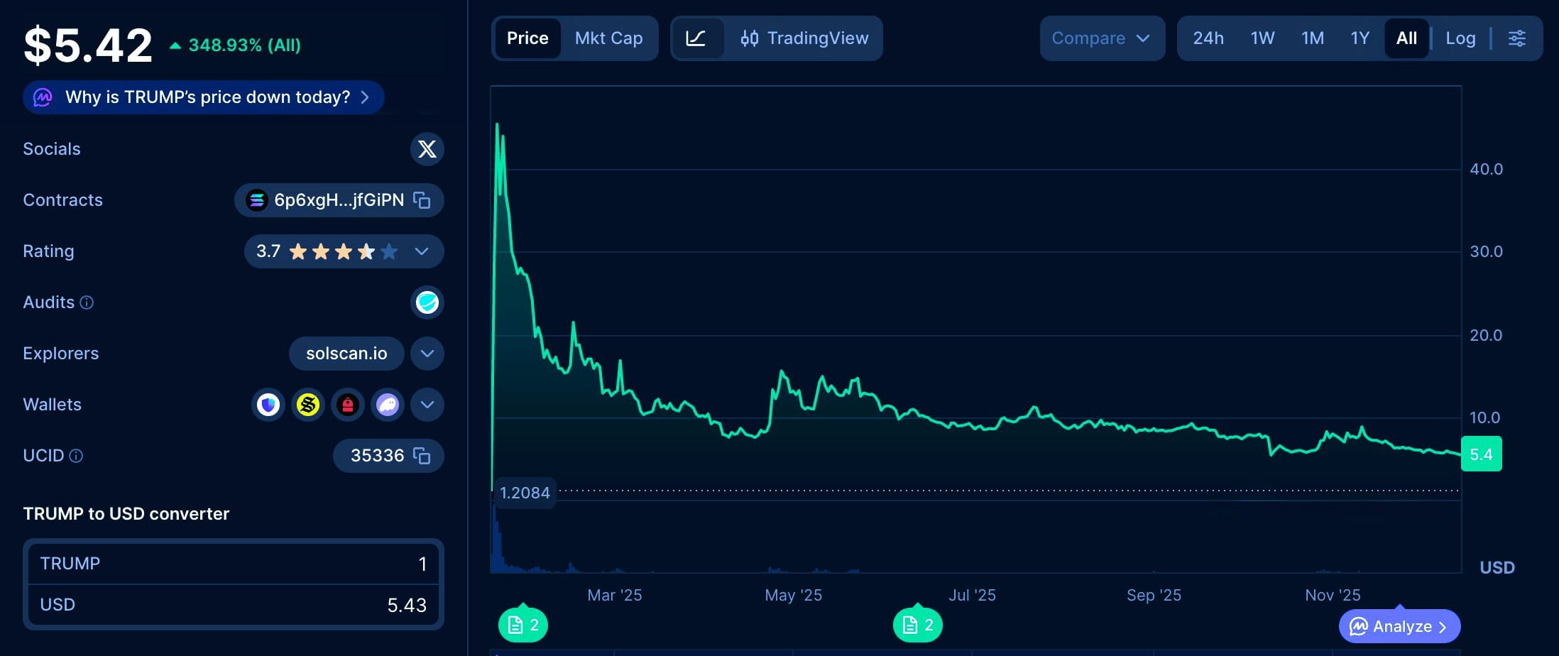 Un claro ejemplo es el token $TRUMP , asociado con Donald Trump. Desde su lanzamiento en enero de 2025, su precio ha caído más del 90% (de un pico de alrededor de $75 a ~$5.42).