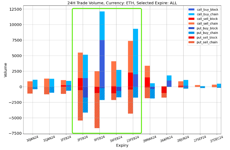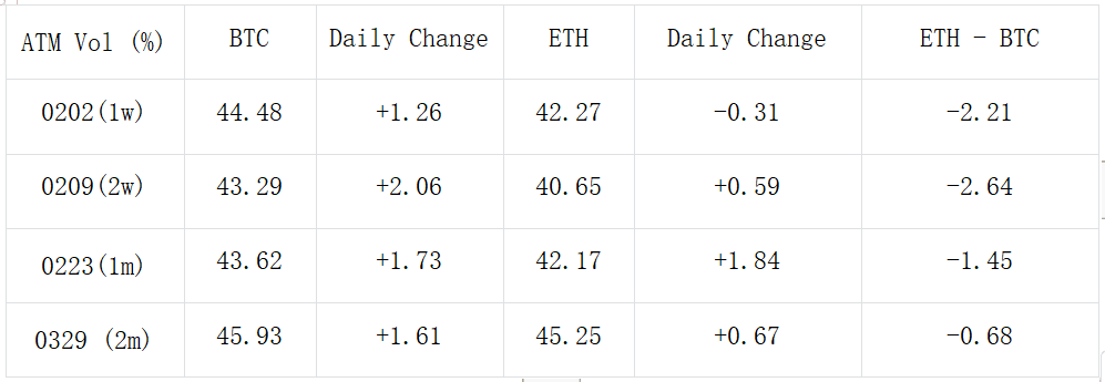 Desde otra perspectiva, Vol Skew, un importante indicador del sentimiento del mercado, volvió a subir hoy. De las transacciones de las últimas 24 horas, también hemos observado que las transacciones de ETH concentradas en febrero mostraron un flujo de riesgo obvio, promoviendo la reversión de 25 dRR en el extremo medio al inicial en términos de BTC, algunas transacciones se desplazaron hacia la mitad; -a largo plazo, y una gran cantidad de opciones de compra se concentran alrededor del Delta 0,2-0,3 del 9 de febrero/29 de marzo/26 de abril, pero al mismo tiempo, también hay una presión de venta obvia el 2 de febrero de esta semana. concentrado en los precios de ejercicio 43000 y 44000, que pueden ser órdenes de stop loss o es una expectativa más baja de otro avance de precios en el corto plazo.