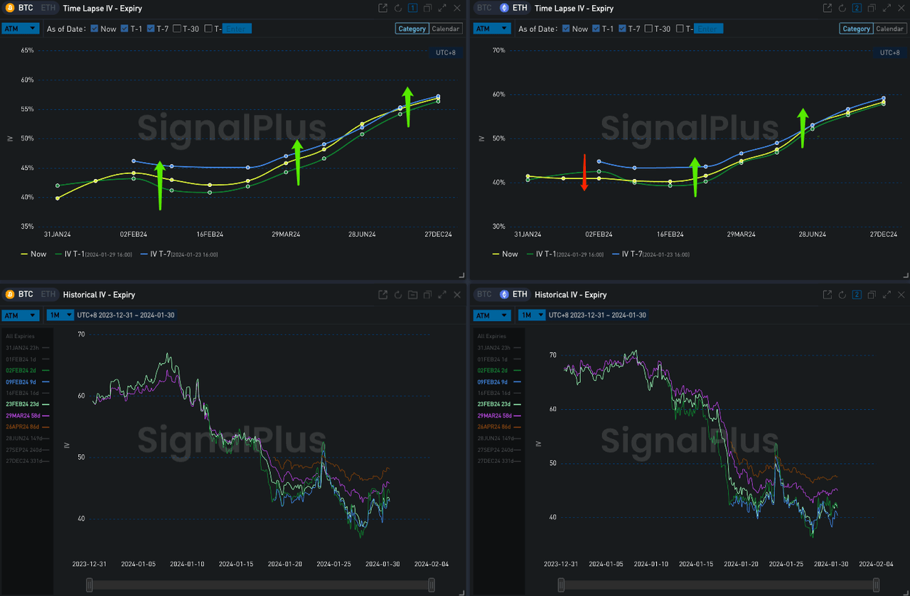 En términos de monedas digitales, BTC continuó liderando el mercado al alza, cerrando con un alza de 1.300 puntos durante el día y volviendo a situarse por encima de los 43.000 dólares. La APR futura en el mercado de futuros también se vio impulsada por esto, alcanzando alrededor del 10%. En términos de opciones, la volatilidad implícita general de BTC aumentó ligeramente entre un 1% y un 2%; ETH aumentó un 1,84% desde el punto más bajo a finales de febrero, y otros períodos aumentaron ligeramente en aproximadamente un 0,6%; La curva ATM se mantuvo sin cambios y aún mantuvo un frente relativamente plano. La situación actual comenzó a mejorar a finales de febrero.