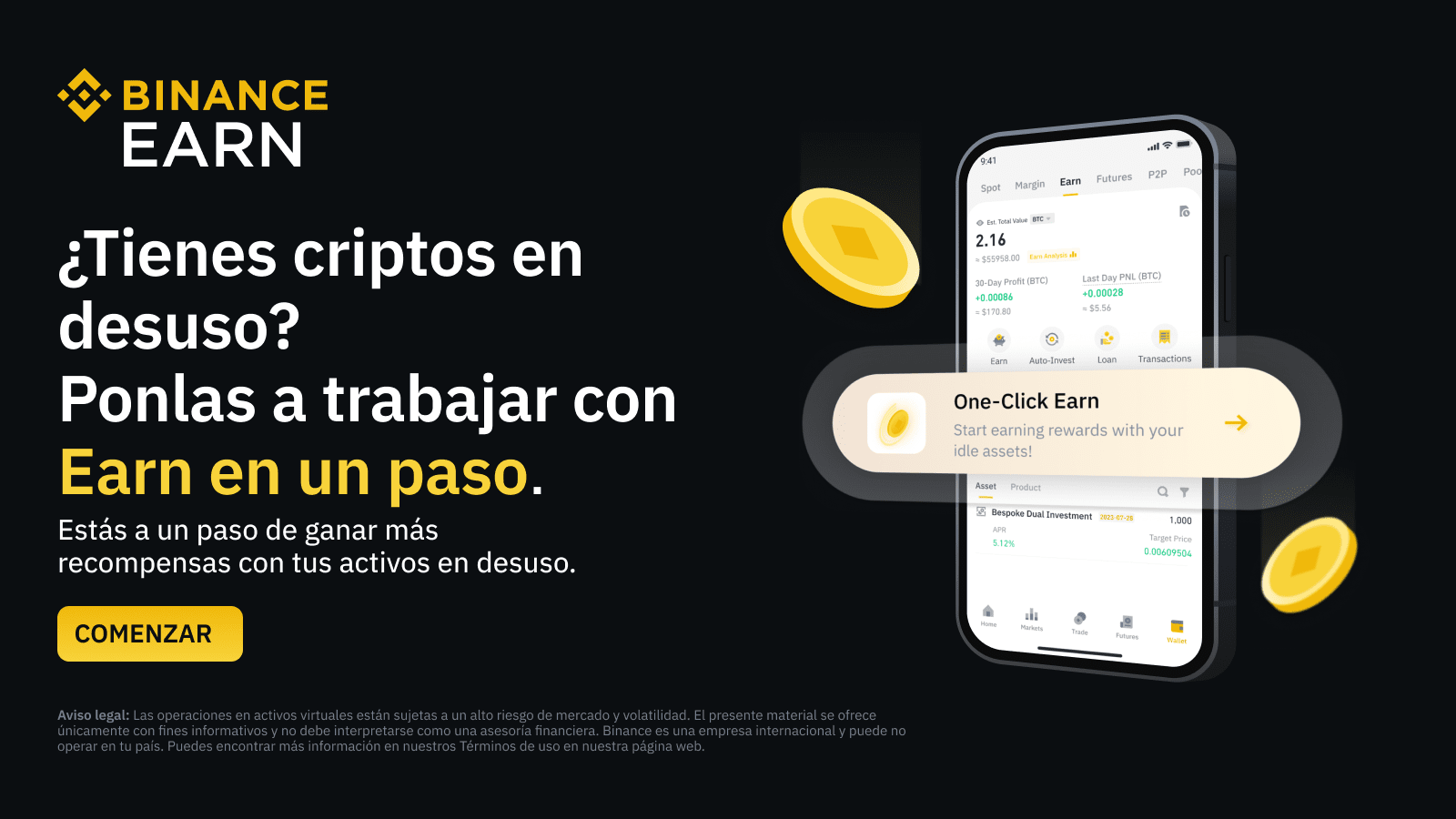 Se recomienda a los usuarios actualizar la aplicación de Binance a la última versión para acceder a la función Earn en un paso. Esta función será compatible con el sitio web de Binance pronto, y no se harán nuevos anuncios al respecto.