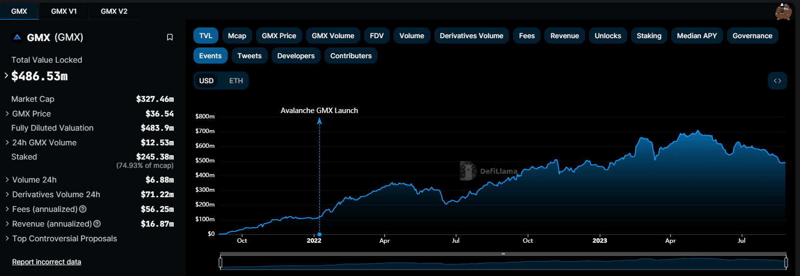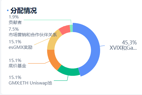 La oferta actual es de 9.308.144 GMX y la circulación es de 8.884.693 GMX. Hasta ahora se han desbloqueado 95. El precio actual de la moneda es de 36 dólares estadounidenses y el precio máximo fue de 90 dólares estadounidenses, el 23 de abril. En términos de distribución de tenencias de moneda, el equipo todavía toma muy poco. Es un muy buen proyecto basado en mecanismos. Luego verifiqué el TVL en la cadena y descubrí que era de 480 millones de dólares estadounidenses y que el volumen de transacciones diarias era de decenas de millones.