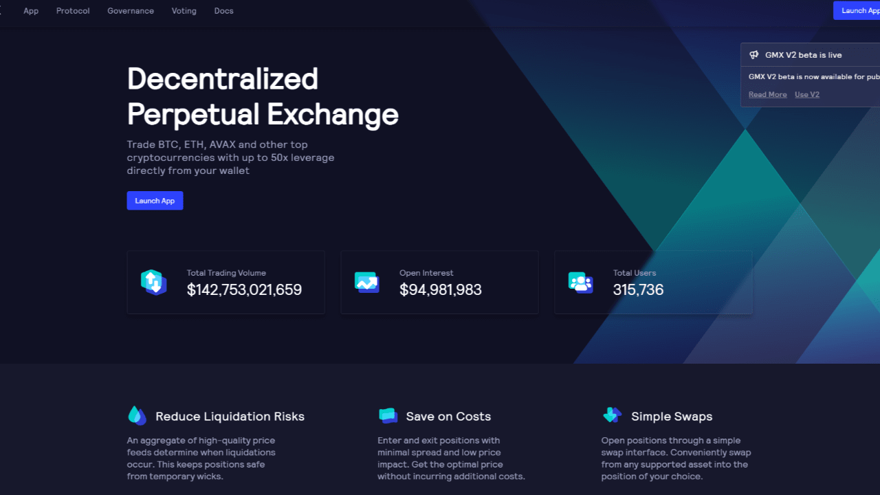 Lanzado en septiembre de 2021, GMX es un intercambio descentralizado perpetuo y al contado, que opera directamente desde las billeteras de los usuarios en una red rápida y económica con un deslizamiento del 0 %, tarifas de 10 pb y un apalancamiento de hasta 50 veces BTC, ETH, AVAX, UNI y LINK, sin KYC ni restricciones geográficas.
