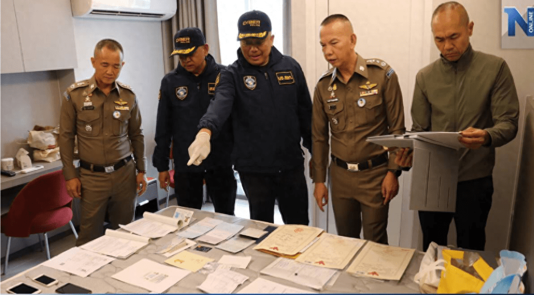 另一处行动点位于Phra Khanong地区,警方逮捕了一名中国籍男子刘某,并查获了大量相关文件。