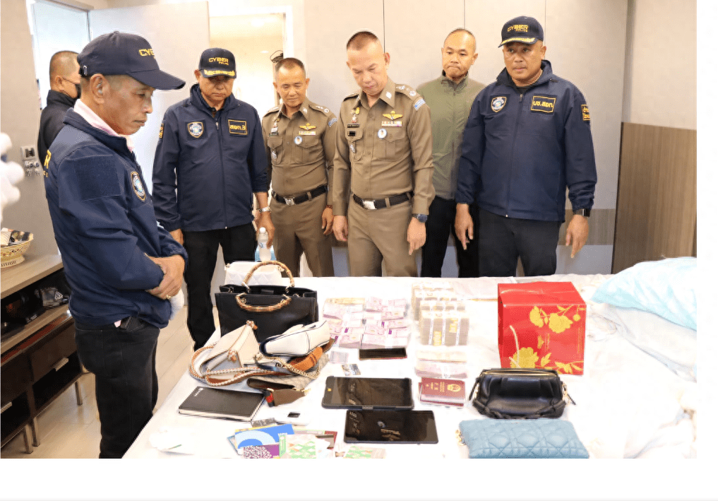 在此次行动中,特别引人瞩目的是警方在曼谷市拉玛九区一家豪华酒店的第4和第5层进行了搜查,并成功逮捕了一对中国籍夫妇,分别是54岁的张某和29岁的周某。警方还缴获了400万泰铢的现金、价值超过4400万泰铢的3套豪华公寓的所有权文件、3辆汽车、银行存折、iPad、100个麻袋,以及大量护照,其中包括中国、柬埔寨和瓦努阿图等国家。