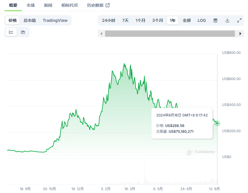 Desde finales del año pasado, a medida que el campo de la inteligencia artificial se ponía de moda, Bittensor se ha destacado. El precio de su token TAO se ha disparado rápidamente desde unos 80 dólares en octubre del año pasado. Una vez superó los 730 dólares en marzo de este año. y su valor de mercado llegó a ascender a unos 4.700 millones de dólares.