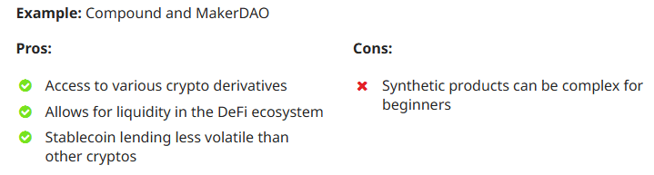 Los activos sintéticos son derivados criptográficos cuyo valor proviene del valor de otros activos. Las principales plataformas DeFi ofrecen productos sintéticos como opciones, swaps y futuros. Por lo tanto, los inversores pueden beneficiarse de la exposición a activos, riesgo configurable y patrones de flujo de efectivo.