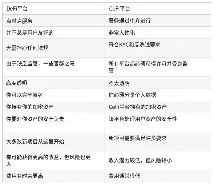 Como puedes imaginar, las finanzas descentralizadas (DeFi) y las finanzas centralizadas (CeFi) son dos conceptos opuestos. DeFi depende de redes descentralizadas y se centra en servicios financieros innovadores y completamente transparentes, operando a través de contratos inteligentes; mientras que CeFi depende de intermediarios tradicionales, donde la plataforma sigue todas las regulaciones en este campo y se enfoca mucho en la experiencia del usuario.