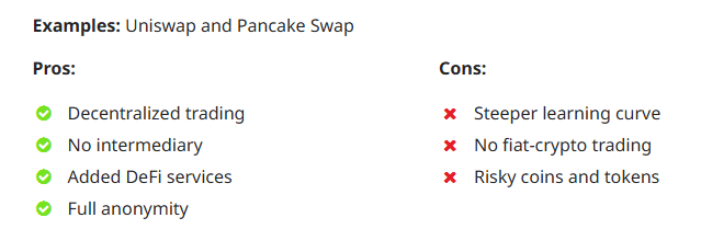 Los DEX facilitan el intercambio de criptomonedas, por lo que no hay opciones de compra en moneda fiduciaria como en las plataformas de intercambio centralizadas, ni se pueden canjear activos criptográficos por efectivo. Para usar un DEX, debe tener una billetera criptográfica que contenga activos digitales.