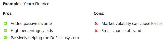 Las ganancias de opciones DeFi como staking y préstamos pueden ser muy altas. Sin embargo, si tomas algunas decisiones incorrectas o compras tokens de bajo rendimiento o te involucras en proyectos fallidos, también podrías perder toda tu inversión.