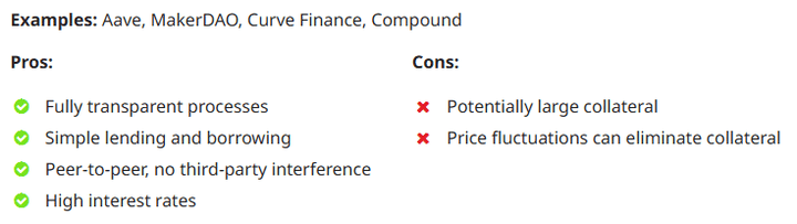 Como su nombre indica, estas plataformas permiten a los usuarios realizar préstamos de criptomonedas. Las personas que desean prestar criptomonedas pueden depositar sus activos en la plataforma y ganar intereses permitiendo que otros tomen préstamos. Los prestatarios deben proporcionar colateral y pagar un interés determinado para pedir prestado criptomonedas.