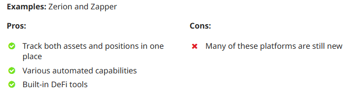 Estas plataformas son compatibles con múltiples cadenas y pueden detectar posiciones DeFi, no solo los activos en la billetera de criptomonedas, y la mayoría de sus funciones están automatizadas. Usando estas plataformas, puedes rastrear todos tus activos y posiciones a través de un único panel.