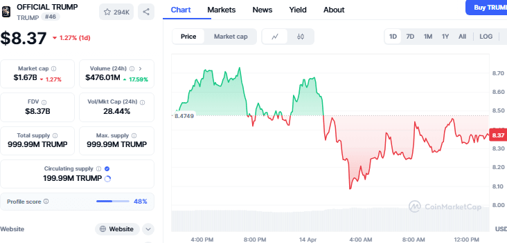 $TRUMP ha mostrado señales de debilidad. Está oscilando alrededor de 8,37 dólares, cayendo más del 1,27% en las últimas 24 horas y un 29% en el último mes. El análisis técnico indica que esta moneda está bajo presión bajista.