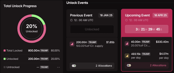 Un gran desbloqueo de tokens TRUMP tendrá lugar el 18 de abril de 2025. Alrededor de 40 millones de tokens, valorados en 330 millones de dólares, serán emitidos. Esto representa el 20% de los tokens actualmente en circulación. Este es el primer gran desbloqueo para esta moneda. Muchos traders están observando para ver cómo reacciona el mercado.