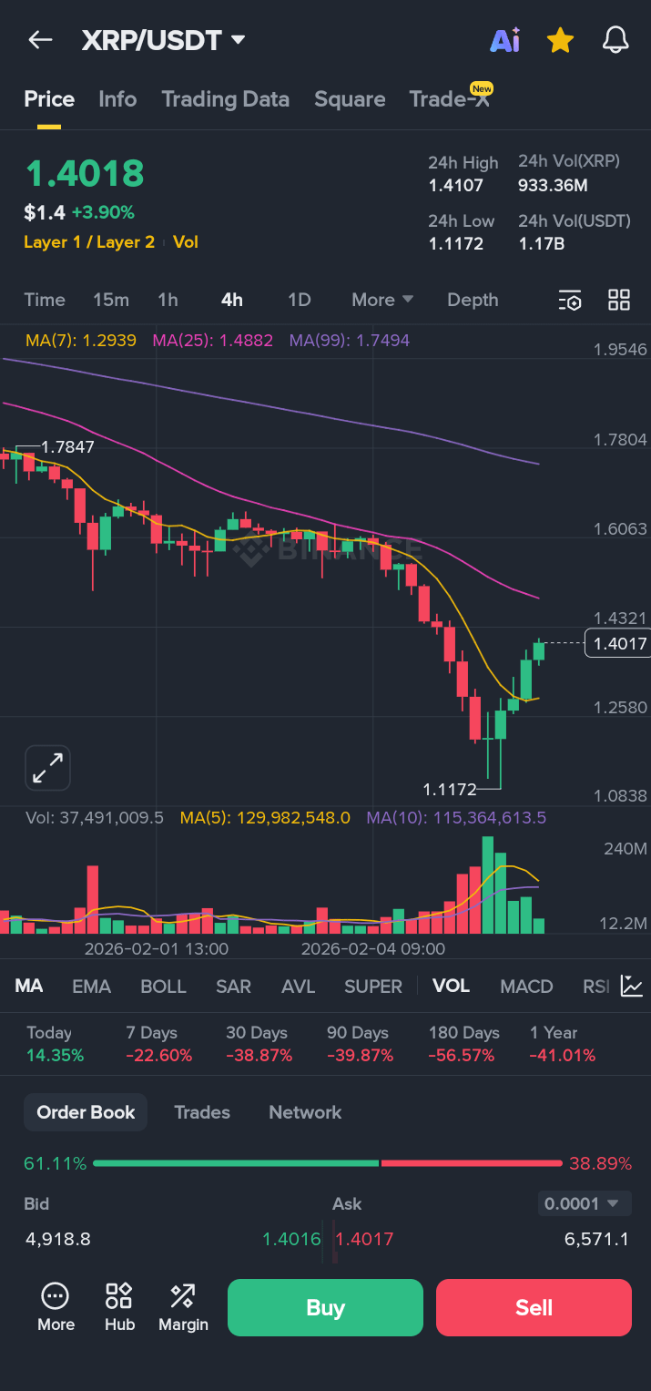 Mira la acción reciente del precio para $XRP. Más temprano hoy, el token se desplomó a un fondo local de $1.1172. Para un principiante, esto parecía el final. Pero para aquellos que observan la profundidad del mercado, era una historia diferente. En la captura de pantalla que compartí antes, $XRP ya había reclamado $1.4018, marcando una recuperación masiva en una ventana de tiempo muy corta.