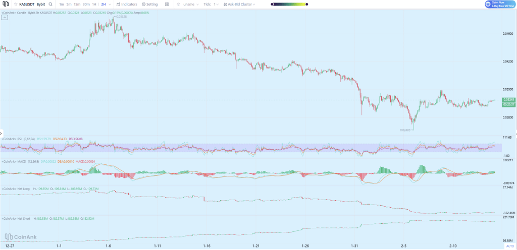 En el gráfico de Kaspa, podemos ver que el token ha pasado semanas bajando desde los altos de principios de enero cerca de la región de $0.05. La tendencia ha sido definida por altos más bajos y presión de venta persistente, con solo rebotes de corta duración en el camino. Incluso después del reciente hito de transacciones, el precio sigue rondando la zona de $0.032, luchando por recuperar cualquier estructura significativa al alza.