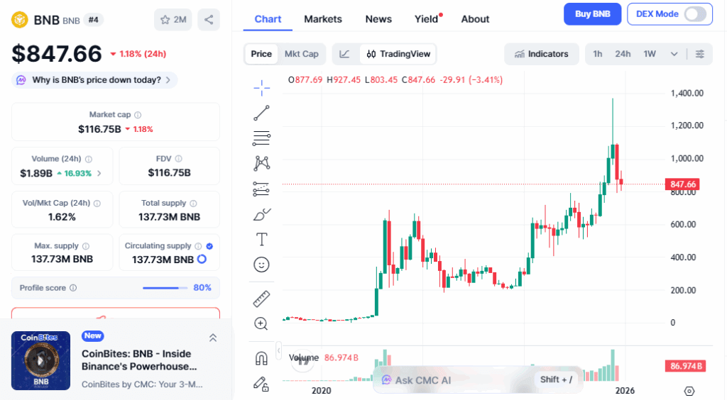 La predicción de precios de BNB para 2026 se ve cada vez más optimista con Hong Kong creando marcos para la inversión institucional en criptomonedas. BNB se está negociando actualmente alrededor de $847 el 23 de diciembre.