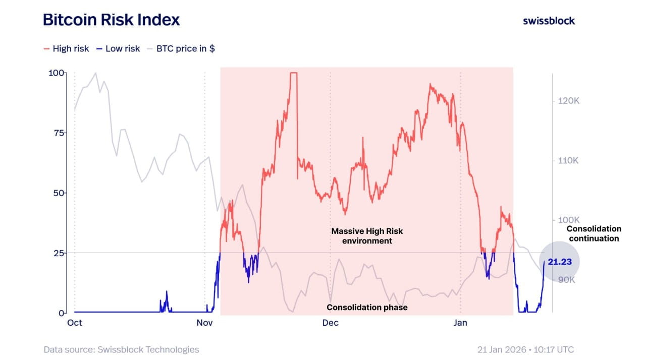 Swissblock: El índice de riesgo de BTC está creciendo, el mercado aún permanece en consolidación.