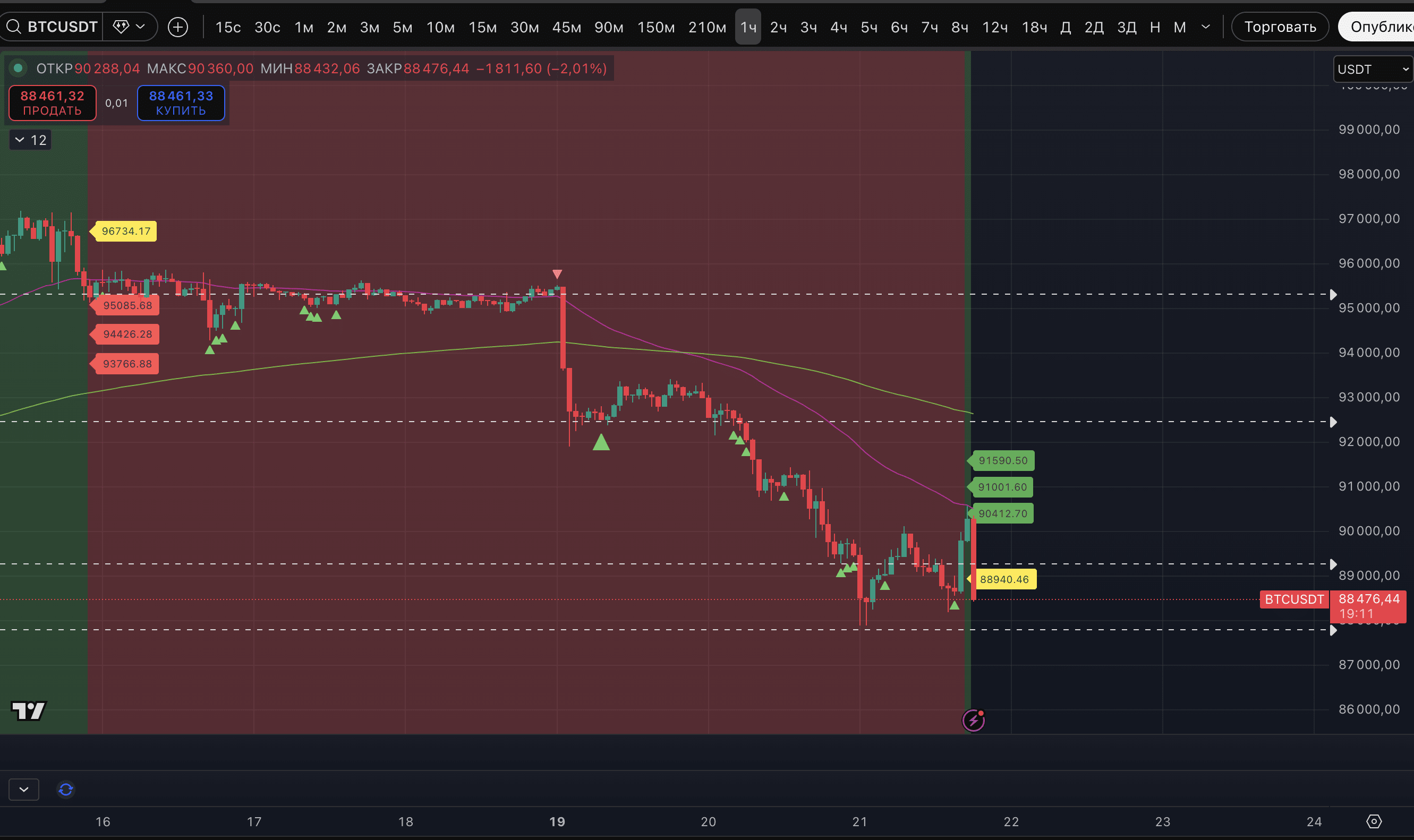Por ahora, como se puede ver, el crecimiento en el discurso de Trump en Davos ha sido absorbido y el gráfico se inclina más hacia la segunda opción. BTC, siguiendo a XRP y SOL, ahora tiene una tendencia alcista sostenida en el marco temporal horario según nuestro indicador. Pero por ahora, enfrenta amenazas serias de ruptura. Si la vela horaria cierra por debajo de 88 740$ y se consolida por debajo del nivel, todo el crecimiento en el discurso de Trump se podrá evaluar como un rebote local de un gato muerto, un short squeeze.