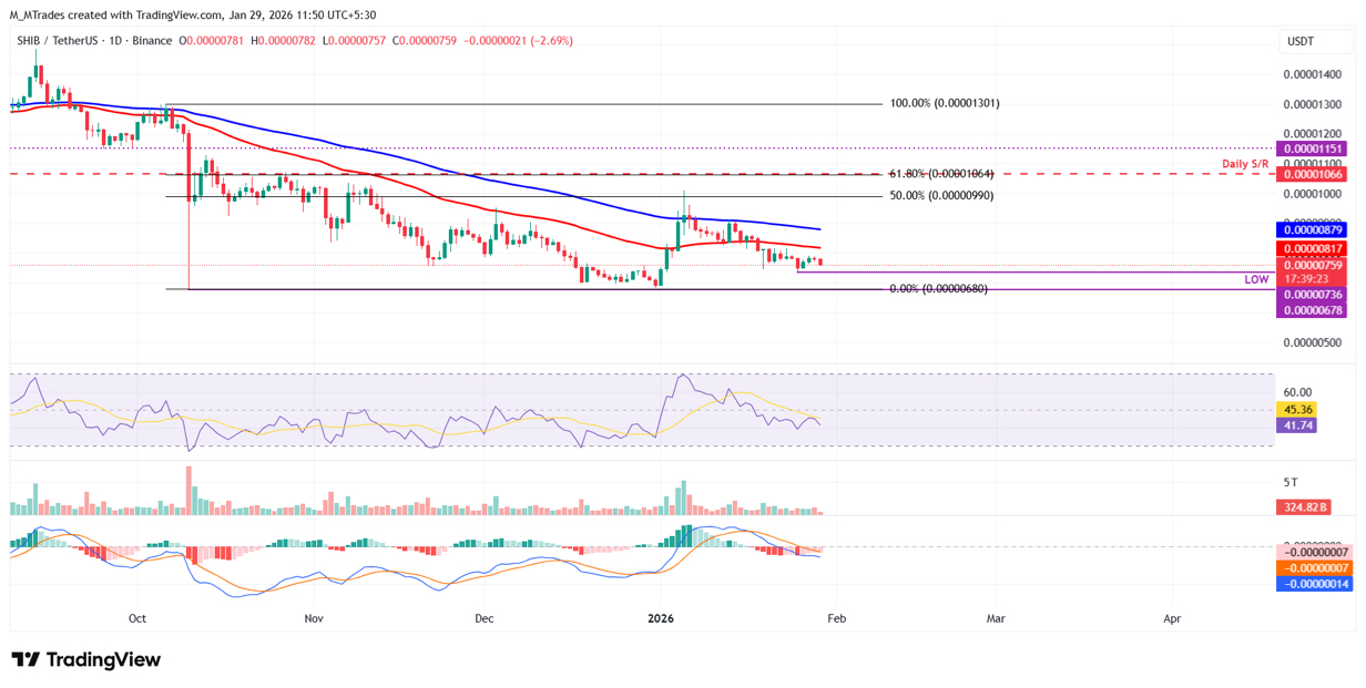 El precio de Shiba Inu ($SHIB ) cae por debajo de 0.0000077 dólares el jueves después de corregirse el día anterior. El sentimiento bajista se refuerza aún más a medida que los poseedores de SHIB venden tokens, aumentando la presión de venta y reduciendo el interés abierto (OI) en el mercado de derivados. Desde el punto de vista técnico, la debilidad del momentum sugiere que la presión bajista sobre la moneda meme continuará.