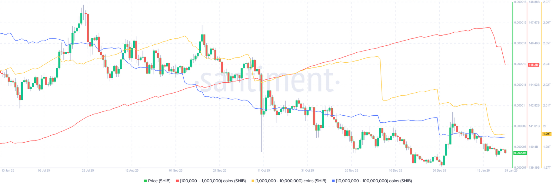 La métrica indica que las ballenas que poseen entre 100,000 y 1 millón (línea roja), de 1 millón a 10 millones (línea amarilla), y de 10 millones a 100 millones (línea azul) se han deshecho de un total de 32.17 mil millones de tokens SHIB desde el 20 de enero hasta el jueves, aumentando la presión de venta.