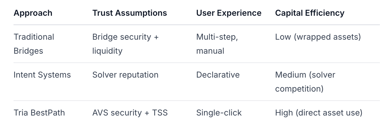 Diferenciación Técnica: A diferencia de los puentes tradicionales que crean activos envueltos o requieren un cambio manual de cadena, BestPath permite la utilización directa de activos a través de cadenas sin capas de abstracción. El sistema utiliza ejecución basada en TSS, por lo que los usuarios nunca tocan puentes, gas o aprobaciones de tokens mientras mantienen la autocustodia completa.