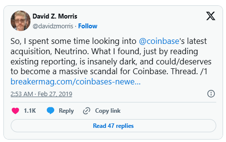 El momento de la publicación de este mensaje coincide con una fuerte ola de oposición dirigida a Coinbase tras la adquisición de Neutrino a finales de febrero de 2019.