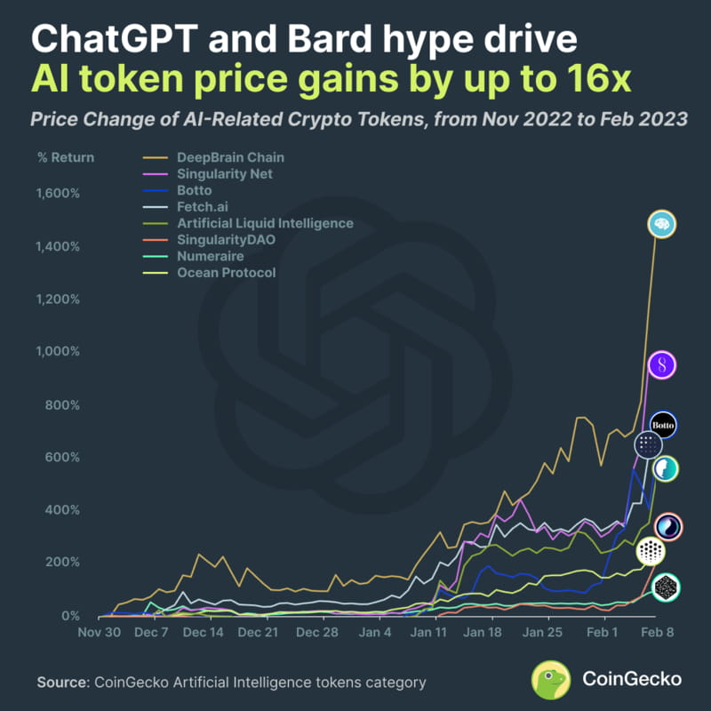 En los últimos dos años, la inteligencia artificial (IA) ha experimentado un crecimiento significativo. ChatGPT ha estado en los titulares desde noviembre de 2022, y la competencia entre Google y Microsoft se está volviendo dura con la inversión de 10 mil millones de dólares de Microsoft en OpenAI y el lanzamiento de su chatbot Bard por parte de Google. Esto ha llevado a un creciente interés en las monedas de IA, y sus precios han asumido tendencias alcistas, como se ve en el gráfico siguiente.