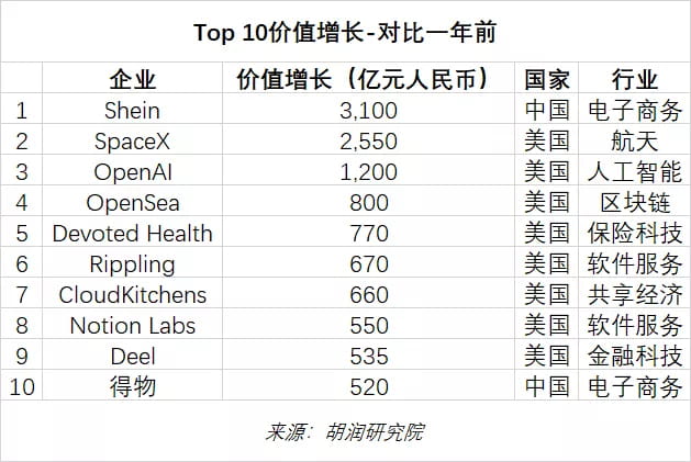 Hurun Report, presidente y director de investigación de Hurun Report, dijo: "Los unicornios están cambiando enormemente nuestras vidas y hábitos de consumo. ChatGPT de OpenAI puede tener el mayor impacto entre todos los unicornios del mundo, con un valor que se eleva a 138 mil millones de yuanes, y alcanzó los 100 millones de usuarios en poco más de dos meses, convirtiéndose en la aplicación de consumo de más rápido crecimiento de la historia. Otras empresas que han aumentado significativamente su valor incluyen la plataforma de moda rápida Shein, con sede en Guangzhou, SpaceX, con sede en Los Ángeles, y el líder del mercado Web3 NFT. OpenSea, el proveedor de seguros médicos Devoted Health, la empresa de software de recursos humanos Rippling y el operador de cocina compartida para llevar CloudKitchens”.