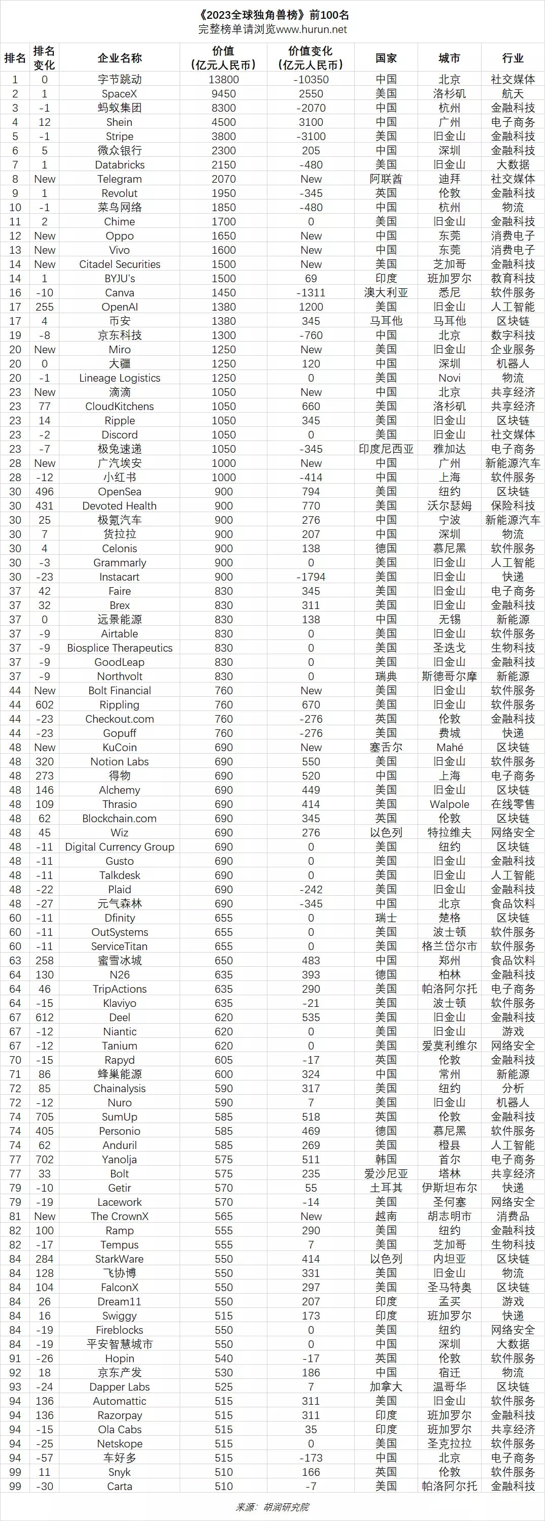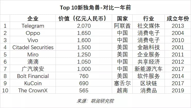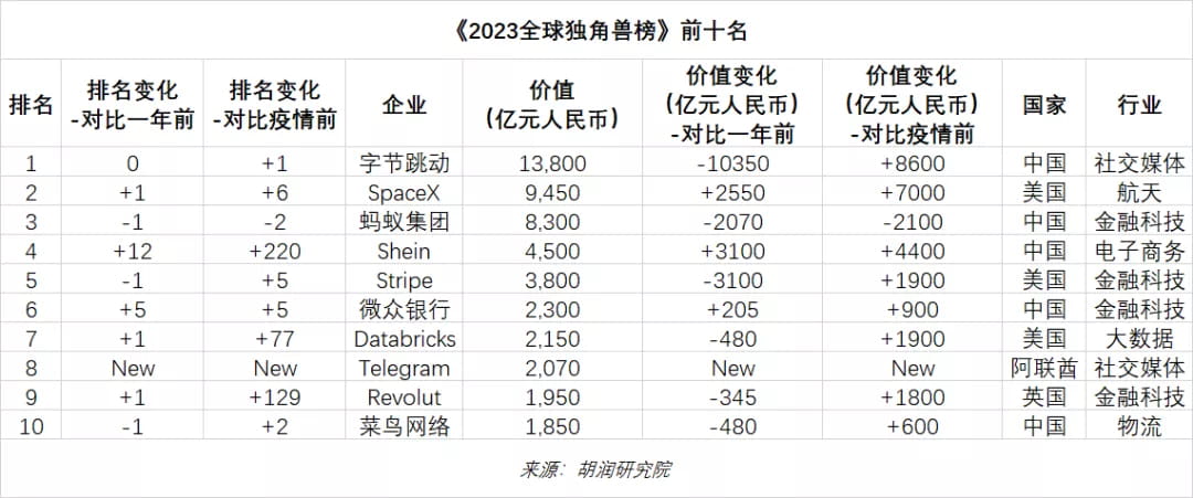 El 18 de abril de 2023, el Instituto de Investigación Hurun publicó el "Índice Global Unicornio 2023" en Guangzhou, que enumera las empresas no cotizadas del mundo fundadas después de 2000 y con un valor de más de mil millones de dólares.