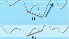Divergencia positiva (Pu): mientras los mínimos del indicador suben, el precio baja.