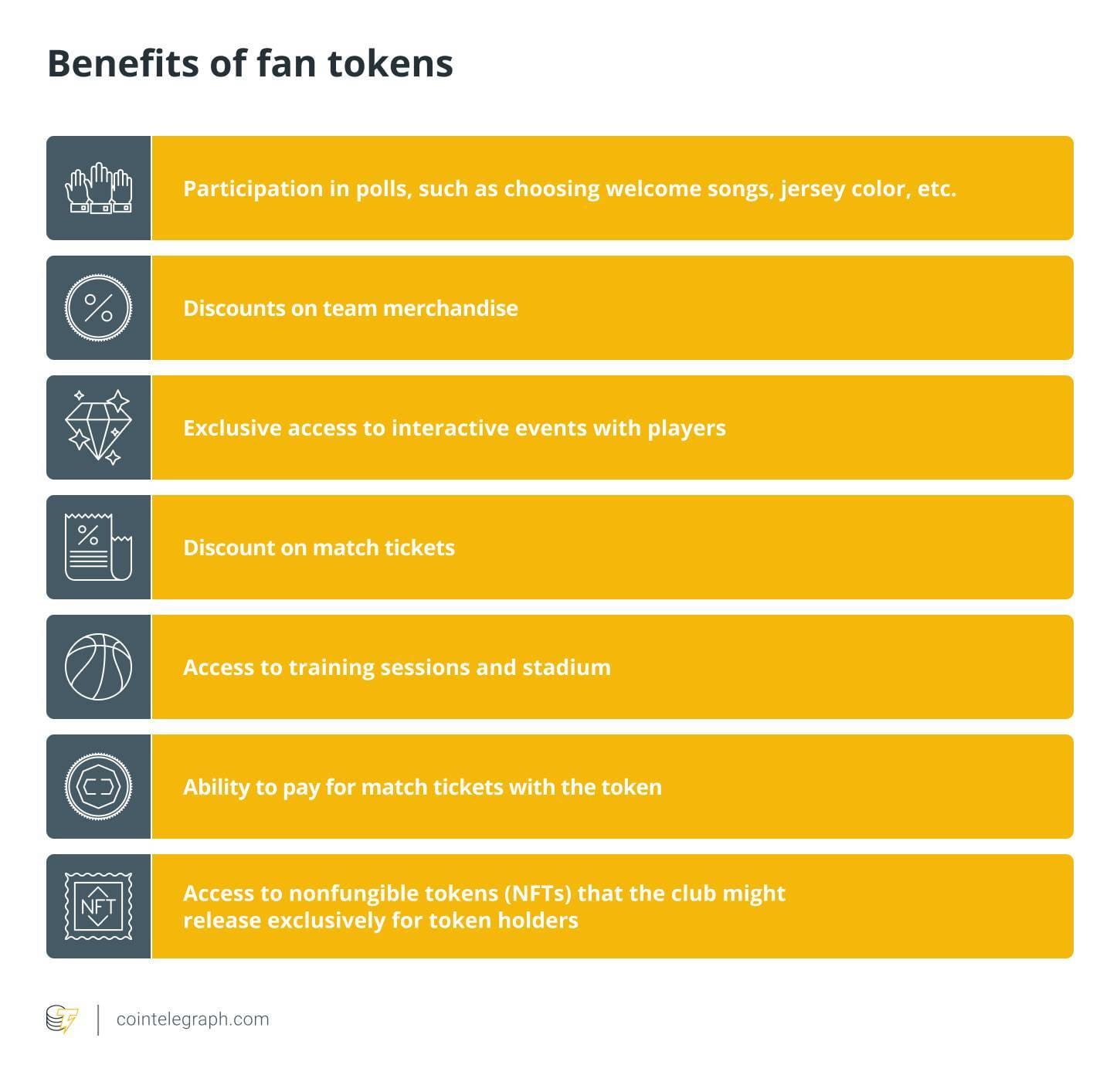 Como sugiere el nombre, los fan tokens son activos digitales que pertenecen a sus titulares (fanáticos de un equipo, club o jugador deportivo específico) y obtienen valor de ellos.